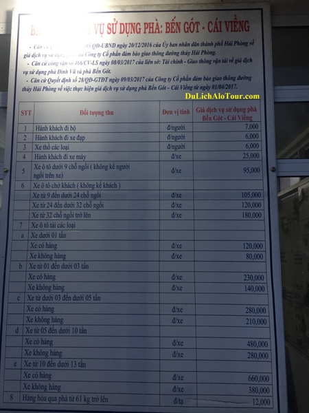 Bảng giá dịch vụ sử dụng phà: Bến Gót - Cái Viềng: