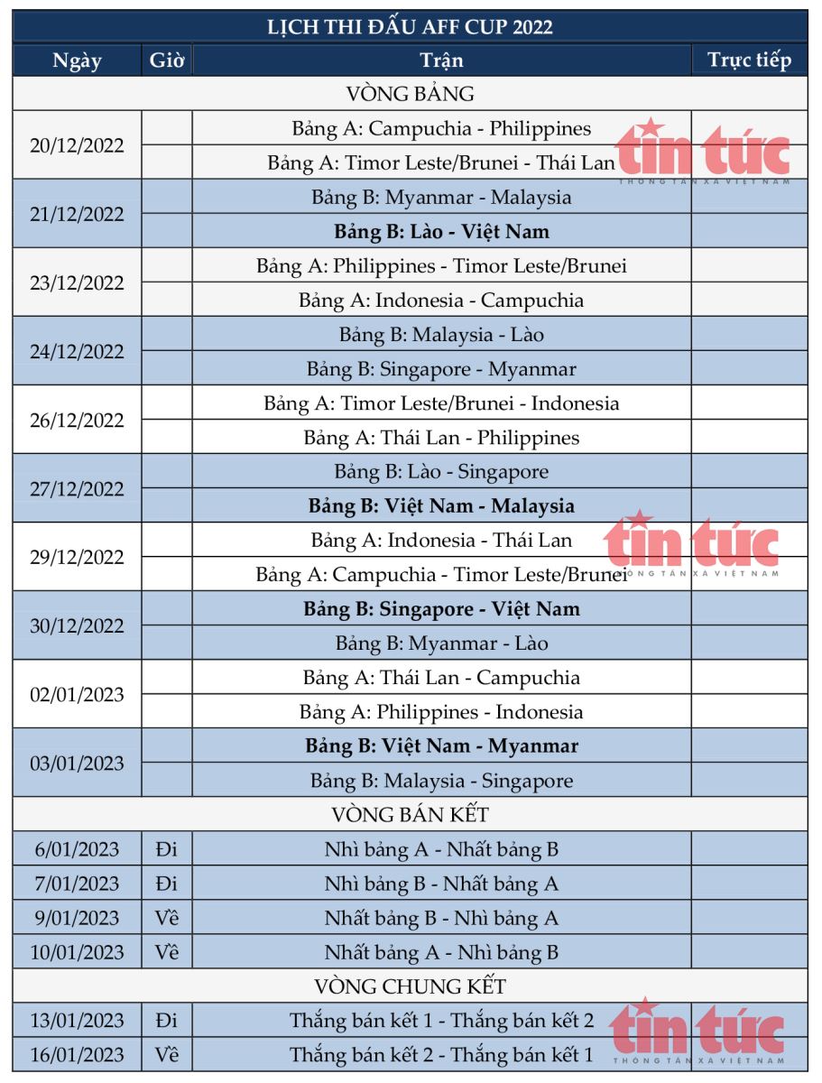 Lịch thi đấu AFF Cup 2022